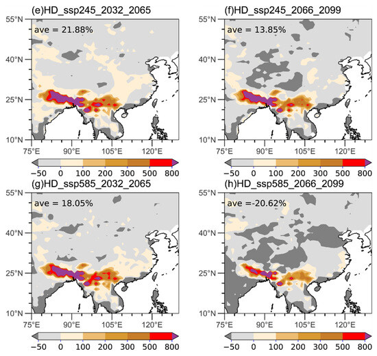 Projected frequency changes (unit: %) in the MD under SSP2-4.5 in (a) 2032–2065 and (b) 2066–2099 and the SSP5-8.5 in (c) 2032–2065 and (d) 2066–2099. Projected changes (unit: %) in the HD under SSP2-4.5 in (e) 2032–2065 and (f) 2066–2099 and under SSP5-8.5 in (g) 2032–2065 and (h) 2066–2099 (reference period 1981–2014 according to ERA5 dataset [27]). The drought threshold is −0.5.