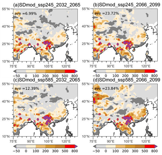 Projected frequency changes (unit: %) in the SD below −1 (moderate) under SSP2-4.5 in (a) 2032–2065 and (b) 2066–2099 and the SSP5-8.5 in (c) 2032–2065 and (d) 2066–2099 (reference period 1981–2014 according to ERA5 dataset [27]).