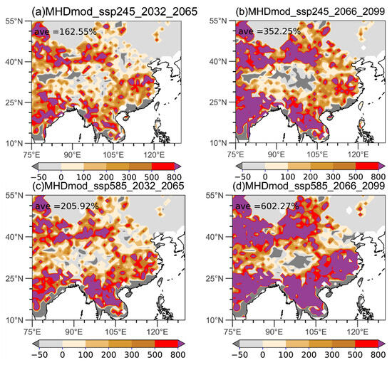 Projected frequency changes (unit: %) in the MHD below −1 (moderate) the SSP2-4.5 in (a) 2032–2065 and (b) 2066–2099 and the SSP5-8.5 in (c) 2032–2065 and (d) 2066–2099 (reference period 1981–2014 according to ERA5 dataset [27]).