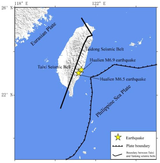 The island of Taiwan is located in the western part of the Circum-Pacific seismic belt, where the Eurasian Plate, the Pacific Plate, and the Philippine Sea Plate converge, with the Philippine Sea Plate moving northwest at about 82 mm/yr toward the Eurasian Plate [31]. The island of Taiwan is roughly divided into the Taidong seismic belt and the Taixi seismic belt, with the Central Mountain Range serving as the boundary line (Figure 1). The Taidong seismic belt mainly includes the Hualian Rift Valley Fault, the Coastal Range, and the East China Sea, which is the region with the most intense seismic activity in Taiwan. The Taixi seismic belt mainly consists of the western foothills and the western coastal plain, which are part of the Eurasian Continental Plate. The Hualian region experienced two earthquakes on 17 September and 18 September 2022, with magnitudes of M6.5 and M6.9, respectively. The Hualian M6.9 earthquake (23.14° N, 121.34° E) occurred at 06:44:13 (UTC) on 18 September, with a focal depth of 10 km (http://earthquake.usgs.gov/earthquakes, accessed on 10 November 2024).