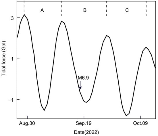 According to previous studies, the turning points of tidal forces are used as the starting points for each cycle. Since 29 August 2022, the tidal force has undergone three consecutive periods of changes from peak to trough and back to peak (Period A, B, and C); Period A represents the period from 29 August to 11 September, Period B from 12–27 September, and Period C from 28 September to 12 October. The Hualian M6.9 earthquake occurred within Period B, and its air temperature background value was taken from September 11, when the tidal force was at its peak. Similarly, the background values for Periods A and C were taken from the peak values on 29 August and 27 September, respectively. Then, subtracting the corresponding background air temperature value from the daily temperature yielded the continuous daily temperature variations.