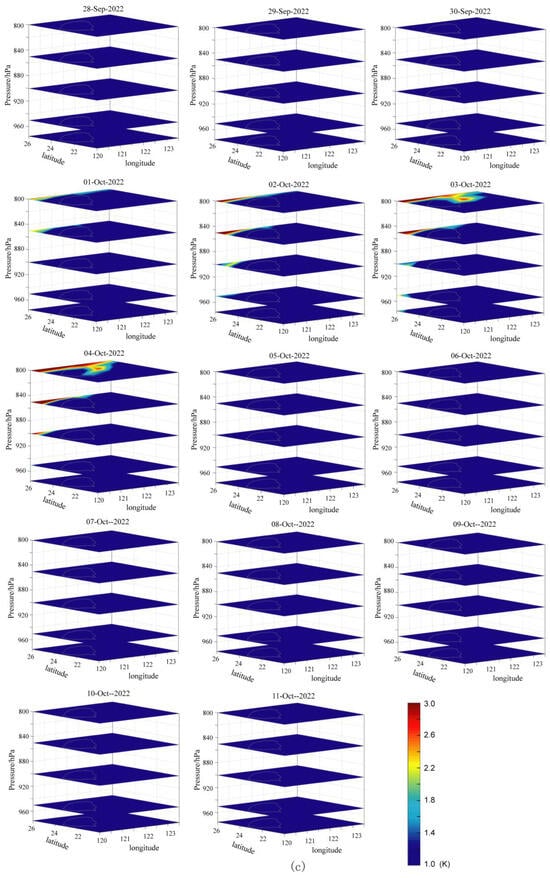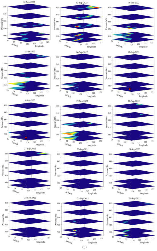 Figure 3 shows the temperature changes at different altitudes, ranging from 975 hPa (near the land surface) to 800 hPa (high altitude), during different periods in the study area. The M6.5 and 6.9 Hualian earthquakes occurred on 17 and 18 September, respectively, within Period B. The air temperature anomaly first appeared in the Hualian area on 12 September (Figure 3b). On 13 September, the air temperature anomaly significantly intensified, with the strongest and widest temperature anomalies occurring near the land surface in the Hualian area. Moreover, as the altitude increased, the amplitude and area of the air temperature anomaly gradually weakened, indicating that this thermal anomaly was likely caused by subsurface tectonic activity. In the results, the anomaly decreased on 16 September. Subsequently, the earthquakes occurred on 17 and 18 September in the regions where the previous air temperature anomalies were observed.
