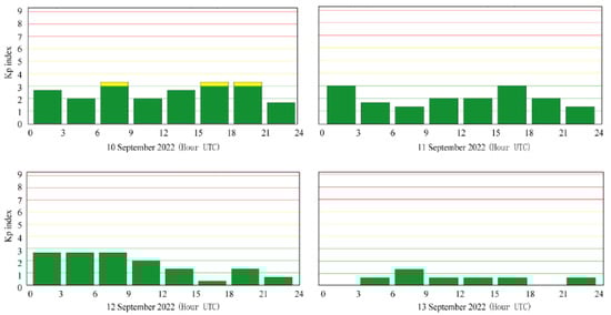 Variation in solar geomagnetic Kp index from 10–13 September 2022. The value of Kp was always less than 5. The blue line indicates weak solar geomagnetic activity, while the yellow and red line indicates strong solar geomagnetic activity.