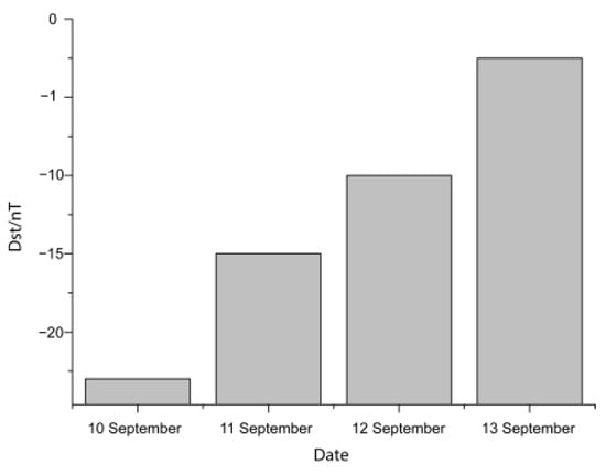 Variation in solar geomagnetic Dst index from 10–13 September 2022. The value of Kp was always greater than −30.