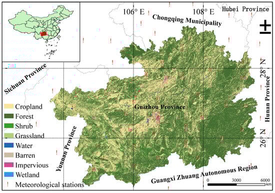 Guizhou Province is located between 24°37′ and 29°13′ N latitude and between 103°36′ and 109°35′ E longitude, representing the core of southwest China’s inland region (Figure 1). The topography of this province is characterized by a slope from high elevations in the west to lower elevations in the east, with a predominant subtropical monsoon climate of warm and humid conditions. The average temperature is approximately 15 °C, and the annual rainfall ranges from 1000 to 1400 mm. The region is notable for its well-developed karst landscape, which covers 61.9% of the total land area in the province, making it one of the world’s largest areas of karst distribution [17]. The extensive karst distribution, with diverse morphological types and significant geographical variation, contributes to the formation of a unique karst ecosystem. Guizhou’s distinctive karst environment and climatic conditions support diverse vegetation types and abundant plant resources, including forests, grasslands, and cultivated land. Previous studies have indicated varying degrees of vegetation phenological changes in Guizhou, with spring phenology generally advancing and autumn phenology exhibiting a delaying trend [18].
