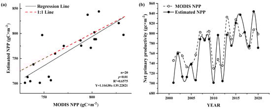 In this study, the CASA model was used to calculate the 16-day mean NPP for Guizhou Province from 2001 to 2020. Cross validation was performed by comparing the NPP estimates from the CASA model with the NPP data product from MOD17A3HGF to evaluate the accuracy of the NPP calculations. Linear regression analysis was applied to determine the differences between the two datasets (Figure 2). The validation results confirm that the CASA model accurately reconstructed the spatial and temporal variations of MODIS NPP. The linear relationship between the NPP estimates from the CASA model and the MODIS NPP data product is expressed as Y = 1.16638X − 139.22821 (R2 = 0.6575, p < 0.01), indicating that the CASA model effectively captures NPP variations within the study area.