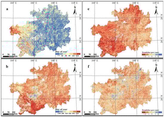 Guizhou Province, located in the eastern part of the Yunnan–Guizhou Plateau, is one of the most typical karst rocky desertification areas in southwest China, with highly fragile ecological conditions [14]. Since 1960, the temperature in Guizhou has shown an upward trend, that has been significant since 1990, when the rate of warming began notably increasing [15]. Changes in temperature and precipitation have affected the vegetation dynamics, with variability in both the magnitude and direction of phenological events [16]. Due to the lack of in situ observation data, evidence of the relationship between phenological changes and NPP in plateau regions remains scarce.