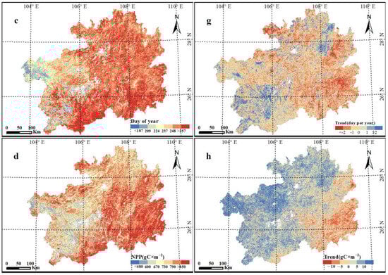 Spatial distribution of average phenological indicators, net primary productivity (NPP), and their trends in Guizhou Province from 2001 to 2020: (a) average Julian day of start of the growing season, (b) average Julian day of end of the growing season, (c) average length of the growing season, (d) average annual NPP, (e) start of the growing season trend, (f) end of the growing season trend, (g) length of the growing season trend, and (h) vegetation NPP trend.