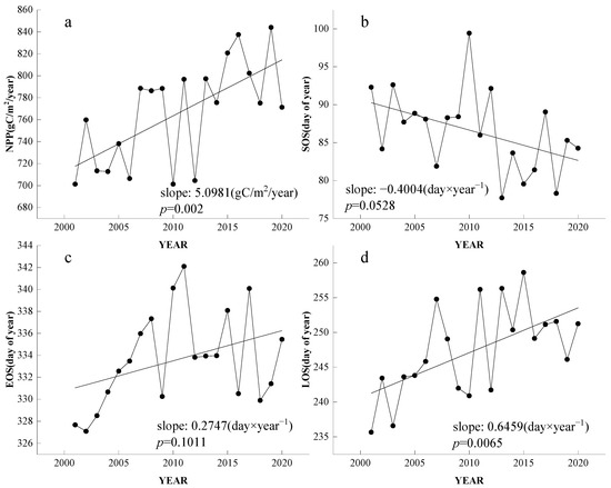 Figure 3e–h present the spatial patterns of phenological indicators and NPP trends from 2001 to 2020. During this period, most of the plateau exhibited an advancing trend in SOS, with 94.61% occurring mainly in the southwestern and northcentral regions. A similar advancing trend in EOS was observed across 78.27% of the plateau. However, particular areas in the central and northeastern parts of the plateau showed a delay in EOS. Since the advancing EOS is smaller than that of SOS, the LOS indicated an extension in more than 61.35% of the study area over the research period. Unlike SOS, EOS, and LOS, the annual NPP showed a decreasing trend in the southeastern region, while increasing in the eastern, central, and northern regions. The areas where NPP increased (72.15%) outnumbered those where it decreased (27.85%), with the most pronounced positive trends observed in the northwestern part of the plateau.