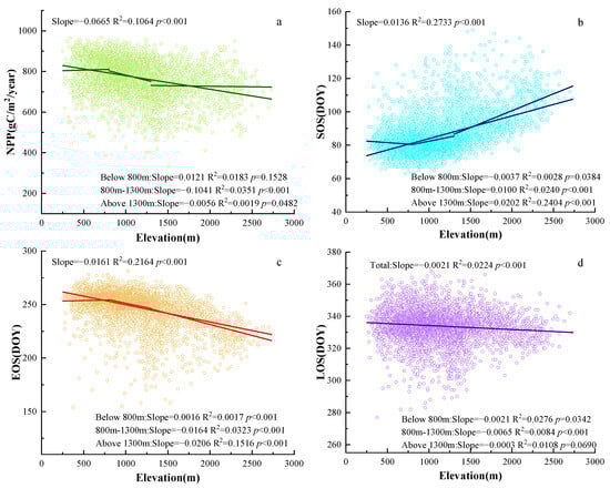 Vertical gradient changes in vegetation phenology and net primary productivity (NPP) in Guizhou Province from 2001 to 2020: (a) relationship between NPP and elevation; (b) relationship between start of the growing season and elevation; (c) relationship between end of the growing season and elevation; (d) relationship between length of the growing season and elevation.