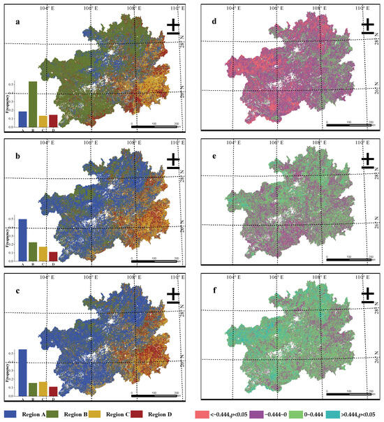 Figure 6a,d illustrate the spatial distribution of the response relationship and correlation coefficients between annual NPP and SOS. A significant negative correlation between NPP and SOS was observed in 79.72% of the region, particularly in the western and northeastern parts of Guizhou Province. Correspondingly, 68.07% of the plateau area exhibited a notable early SOS, with an increase in NPP in the western and northern parts of Guizhou (Region B), where significant increases in temperature and precipitation were also observed. These climatic increases led to a notable advancement in SOS and an increase in NPP. For Region A, the second largest region in central and northern Guizhou’s solar radiation and temperature were shown to be the primary climatic factors influencing vegetation growth, with correlation coefficients of 0.7155 and 0.6654, respectively. Despite a delay in SOS, NPP showed an upward trend with increases in solar radiation and precipitation. This finding contrasts with the majority of existing studies, which found that global warming leads to an earlier SOS [31,32,33]. This could be due to increased water demand when the growing season surpasses the temperature limitations on vegetation, leading to a delay in SOS [34]. These patterns indicate that although the climate in Guizhou is generally warming, the response of NPP to phenological changes remains complex.
