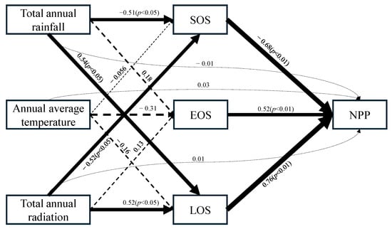 Structural equation model (SEM) representing the relationships between climatic factors, net primary productivity, start of the growing season, end of the growing season, and length of the growing season. Note: The values on the lines represent standardized path coefficients. The thickness of the arrows indicates the magnitude of the standardized coefficients. Solid lines represent significant relationships (p < 0.1), while dashed lines indicate nonsignificant relationships.