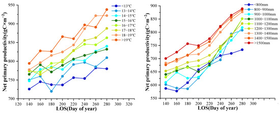 To delve deeper into the effects of temperature and precipitation on vegetation productivity and LOS, we further analyzed the relationships between NPP, phenology, and climate across different temperature and precipitation zones based on historical climate data. As shown in Figure 8, the response of NPP to LOS varies with the temperature gradient. Although the increase in temperature enhances autumn respiration to a greater extent than autumn photosynthesis, it also advances the start of the growing season (SOS) and extends its length (LOS), thereby prolonging the period of vegetation photosynthesis. Consequently, as the temperature increases, the trend of NPP growth is intensified. When temperatures exceed 19 °C, NPP increases from approximately 795 gCm−2 at 140 days to about 940 gCm−2 at 280 days. However, at temperatures below 13 °C, NPP increases from about 725 gCm−2 at 140 days to approximately 780 gCm−2 at 280 days. At a fixed temperature, NPP does not increase steadily with the extension of LOS but shows fluctuating growth. Across different precipitation zones, this growth trend of vegetation NPP with the extension of LOS is generally consistent. NPP increases relatively slowly during the first 200 days of the growing season, and then accelerates. This may be due to the fact that in the early stages of vegetation growth, neither temperature nor light reaches the optimal conditions for activating photosynthesis. Therefore, there is a relatively slow increase in vegetation NPP with increasing precipitation. However, when both temperature and light reach the conditions suitable for vegetation photosynthesis, there is a more rapid increase in vegetation NPP with increasing precipitation. The varying trends in NPP with LOS reflect the profound influence of climate on the response mechanisms of NPP to phenological changes.