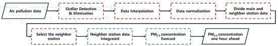 Figure 1 presents a flowchart of the proposed method for forecasting concentration. The process is divided into two main steps: the preprocessing step, denoted by red dotted lines, and the forecasting step, denoted by blue dotted lines.