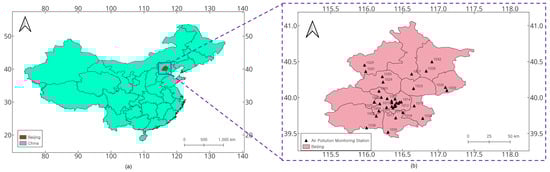 Locations of air pollution monitoring stations: (a) Beijing’s location within China. (b) Air pollution monitoring station locations in Beijing.
