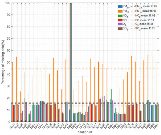 Figure 2 shows the locations of the stations on the map, while Table 2 lists the coordinates for each station. Figure 3 displays the missing ratio of air pollution data for each station, where the x-axis represents the station ID and the y-axis denotes the percentage of missing data. Blue, orange, green, red, purple, and brown correspond to , , , CO, , and , respectively. The bars represent the missing ratio for each pollutant, while the line indicates the mean missing ratio across all pollutants. As shown in Figure 3, exhibits the lowest missing rate, whereas shows the highest. Furthermore, Station 1022 has the highest missing rate across all pollutants except for . As a result, this study excludes Station 1022 and utilizes data from the remaining stations. For these stations, missing data were interpolated and used in the forecast.