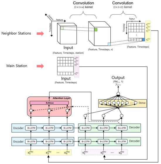 Severe air pollution problems continue to increase because of accelerated industrialization and urbanization. Specifically, fine particulate matter () causes respiratory and cardiovascular diseases, and according to the World Health Organization (WHO), millions of premature deaths and significant health burdens annually. Therefore, concentration forecasting is essential. This study proposed a method to forecast concentrations one hour after using Sequence-to-Sequence Attention (Seq2Seq-attention). The proposed method selects neighboring stations using minimum redundancy maximum relevance (mRMR) and integrates their data using a convolutional neural network (CNN). The proposed attention score and Seq2Seq are used on the integrated data to forecast concentration after one hour. The performance of the proposed method is validated through two case studies. The first comparison evaluated the performance of the conventional attention score against the proposed attention scores. The second comparison evaluated the forecasting results with and without considering neighboring stations. The first study showed that the proposed attention score improved the performance index (Root Mean Square Error (RMSE): 3.48%p, Mean Absolute Error (MAE): 8.60%p, : 0.49%p, relative Root Mean Square Error (rRMSE): 3.64%p, Percent Bias (PBIAS): 59.29%p). The second case study showed that considering neighboring stations’ data can be more effective in forecasting than considering that of a standalone station (RMSE: 5.49%p, MAE: 0.51%p, : 0.67%p, rRMSE: 5.44%p, PBIAS: 46.56%p). This confirmed that the proposed method can effectively forecast the concentration after one hour.