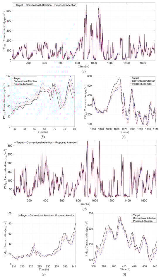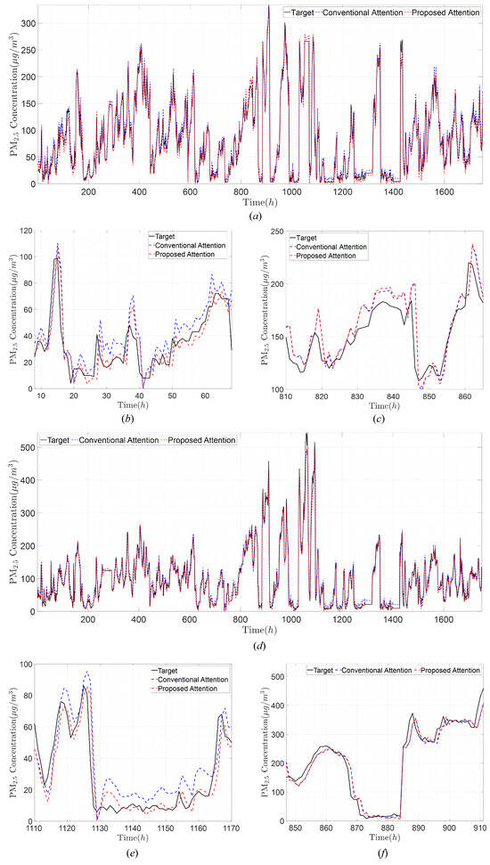 In Case Study 1, we compared the results of forecasting concentrations according to attention scores. Figure 5 and Figure 6 show the concentration forecasting results for stations 1013, 1018, 1005, and 1023. The x-axis represents time, and the y-axis represents concentration. The black line shows the actual observed values. The blue dotted line represents the conventional attention score forecast. The red dashed line represents the proposed attention score forecast. Figure 5 and Figure 6 (a,d) present the forecasting results for the test data period. Subfigures (b,e) show enlarged views of periods with average concentrations below 100, where frequent changes occur. Similarly, (c,f) focus on periods with concentrations above 100, which also exhibit frequent changes.