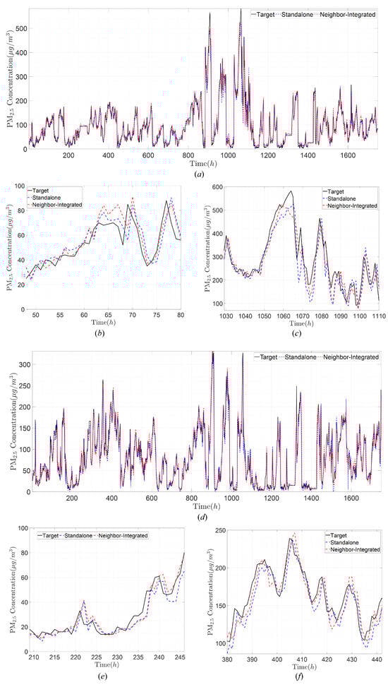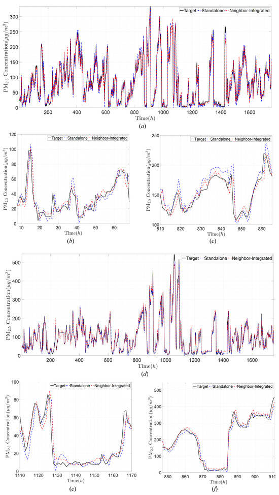 Figure 7 and Figure 8 show the results of forecasting concentration by station. In Figure 7 and Figure 8 (a,d), the results of forecasting concentration for the test data period are shown. In (b,e), the focus is on the periods where the average concentration is below 100 and changes frequently, while in (c,f), the focus is on the periods where the concentration is above 100 and changes frequently.