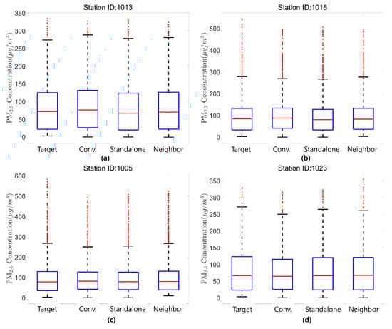 Boxplot of concentration forecasting result for Station: (a) 1013. (b) 1018. (c) 1005. (d) 1023.
