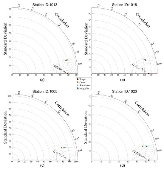 Regarding the RMSE, the forecast error decreased at all stations. The RMSE of Station 1013 decreased by approximately 4.34% from 16.9103 to 16.1756 when forecasting considered the neighboring stations, compared to when forecasting considered a standalone station, and that of Station 1018 decreased by approximately 8.39% from 21.4842 to 19.6820. In addition, that of Station 1005 decreased by approximately 3.44% from 22.0825 to 21.3221, and that of Station 1023 decreased by approximately 5.64% from 16.2714 to 15.3535. The average RMSE of all stations decreased by approximately 5.49% from 19.1871 to 18.1333 when considering the neighboring stations, confirming that the performance improved overall. There are also some improvements in the MAE. The MAE of Station 1013 decreased by approximately 4.45% from 10.2671 to 9.8101, and there were also slight decreases in MAE at Stations 1005 and 1023. However, the MAE at Station 1018 increased slightly from 12.2573 to 12.7890; overall, the average MAE decreased slightly from 11.3802 to 11.3217, showing a decrease in forecasting error. The shows that the overall explanatory power of the model is improved by considering neighboring stations. Station 1018 showed the most considerable improvement, increasing from 0.9380 to 0.9480, and Station 1023 also increased from 0.9336 to 0.9409. The average of all stations increased by approximately 0.67% from 0.9377 to 0.9444, indicating that the model better explains data variation. The rRMSE also decreased at most stations, indicating an improved forecasting performance. It decreased from 0.2017 to 0.1930 at Station 1013, from 0.2155 to 0.1974 at Station 1018, and from 0.2046 to 0.1931 at Station 1023. The overall average decreased by approximately 5.44% from 0.2115 for the conventional model to 0.2000 for the proposed model, which can be evaluated as an improvement in model performance. Finally, The PBIAS exhibited variations across stations, reflecting differences in forecasting bias. At Station 1013, the PBIAS improved significantly from 1.3573 to 0.3105, indicating a notable reduction in over-forecasting bias. At Station 1018, the PBIAS shifted from 2.6337 to −0.5673, demonstrating a transition from over-forecasting to under-forecasting with reduced bias. At Station 1005, the standalone station had a PBIAS of −1.0378, which changed to −1.9433 with the neighbor stations, suggesting an increase in under-forecasting bias. Similarly, at Station 1023, the PBIAS decreased from 2.1168 to 0.4267, highlighting a reduction in forecasting bias. On average, the PBIAS improved from 1.5364 with the conventional method to −1.8120 with the proposed method, confirming a reduction in overall forecast bias and improved accuracy.