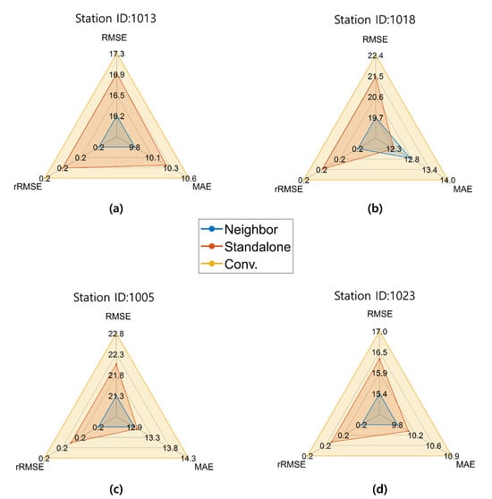 Figure 11 shows the results for Case Studies 1–2 as radar charts. RMSE, MAE, and rRMSE are performance indices representing the magnitude of forecasting errors, with smaller values indicating better model performance. On the other hand, the better the performance of the model matches the actual data, the higher increases. Additionally, PBIAS values closer to zero indicate smaller discrepancies between the forecasted and actual values. Because of these differences, using all these performance indices simultaneously in a radar chart could lead to interpretational confusion. Therefore, only RMSE, MAE, and rRMSE are used in the radar chart to provide an intuitive and consistent performance evaluation. The results from the models applied to each station, as reflected in the radar chart, demonstrate that the Neighbor model consistently outperforms the Conv. and Standalone models in terms of RMSE and rRMSE across all stations. At Station 1013, the Neighbor model showed the lowest RMSE (16.1756), MAE (9.8101), and rRMSE (0.1930), indicating that it provides the most accurate forecasting with the smallest errors. A similar trend was observed at Station 1018, where the Neighbor model outperformed the Conv. model in RMSE (19.682) and rRMSE (0.1974), but the Standalone model showed the best MAE (12.2573). At Station 1005, the Neighbor model had the lowest RMSE (21.3221) and rRMSE (0.2166), while the Standalone model showed the best MAE (12.9601), demonstrating the variability of the models’ performance across different metrics. Finally, at Station 1023, the Neighbor model exhibited the best performance with the lowest RMSE (15.3535), MAE (9.8057), and rRMSE (0.1931). These results consistently show that incorporating neighboring station data leads to more accurate and reliable concentration forecasting across different stations, especially in terms of RMSE and rRMSE.