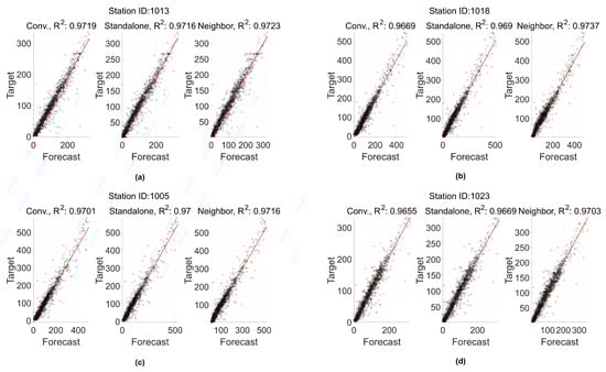 Figure 12 shows the results for Case Studies 1–2 as scatter plots. In Figure 12, the red line represents the line. represents the linear regression fit, showing the relationship between the forecast and actual values. The Neighbor model achieved the highest value of 0.9723 at Station 1013, slightly surpassing the Conv. model (0.9719) and the Standalone model (0.9716). All three models demonstrated a strong linear correlation with the actual values, indicating reliable forecast accuracy. However, the Neighbor model showed the closest alignment with the observed values. For Station 1018, the Neighbor model exhibited superior performance, achieving an value of 0.9737. This result outperformed both the Conv. model (0.9669) and the Standalone model (0.969). These findings highlight that integrating data from neighboring stations improves forecasting accuracy and better matches actual data. At Station 1005, the Neighbor model recorded an value of 0.9716, narrowly exceeding the Conv. model (0.9701) and the Standalone model (0.97). Although the performance differences among the three models were small, the Neighbor model demonstrated a distinct advantage in capturing the underlying patterns in the data. Station 1023 also saw the Neighbor model achieving the best value of 0.9703, outperforming the Standalone (0.9669) and Conv. (0.9655) models. This consistent performance across stations underscores the effectiveness of incorporating spatial data for more accurate forecasting.