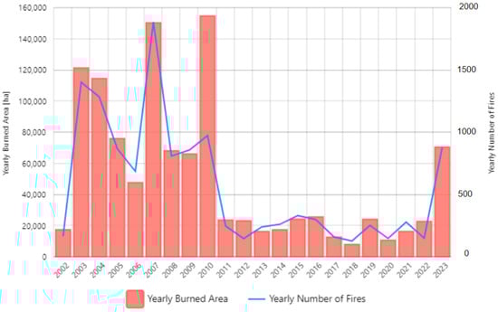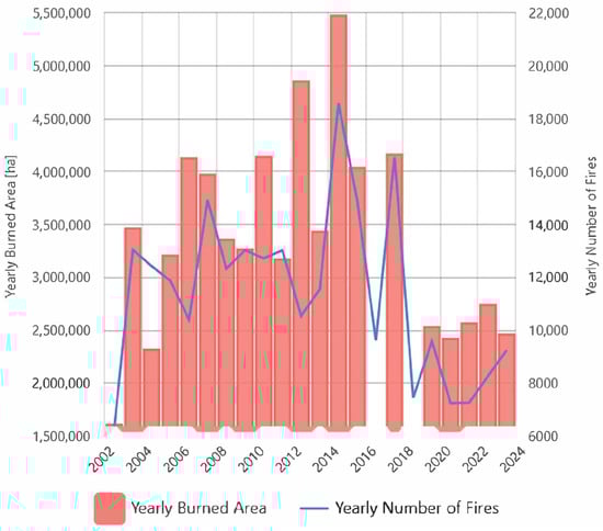 According to the statistical data on forest fires (https://gwis.jrc.ec.europa.eu/apps/country.profile/charts/ba (accessed on 7 September 2024)), from 2002 to 2023, China recorded 251,000 forest fire incidents, as shown in Figure 1. On average, there were approximately 11,400 fire occurrences each year, resulting in a deforested area close to 70.43 million hectares. Considering that China’s forest area is about 175 million hectares, accounting for 3.9% of the global total forest area and ranking fifth in the world, the incidence of forest fires in China constitutes 10% of the worldwide total. These figures highlight the threat of forest fires to the global economy and the immense destruction and loss they cause.