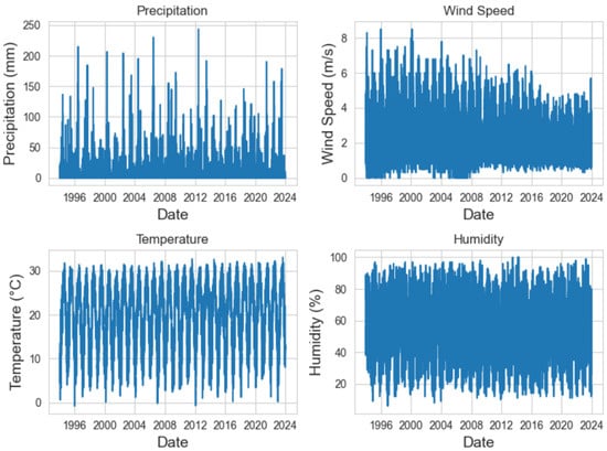 The processing and analysis of these geospatial data aim to deeply understand the potential risk factors of forest fires in the Guangxi region, especially under the premise of evaluating the impact of climate change. This study aims to explore how climate change affects the risk of forest fires in the Guangxi region. To establish the basic pattern of climate change, we first use time series graphs to examine the changes in four vital meteorological variables: daily precipitation, daily average wind speed, daily average temperature, and daily average relative humidity. Time series analysis of these variables reveals their fluctuation characteristics, trends, and possible seasonal or periodic patterns. Specifically, the daily average temperature shows significant seasonal changes, with high temperatures in summer and low temperatures in winter. Although the relative humidity fluctuates in the annual distribution, its variation range is less pronounced than temperature and precipitation. The fluctuations of daily rainfall and average wind speed are relatively large, as shown in Figure 4. These comprehensive charts show the changing trends of daily precipitation, daily average wind speed, daily average temperature, and daily average relative humidity in the Guangxi region from 1994 to 2023. By smoothing the data, we can more accurately identify each variable’s long-term trends and seasonal changes, which is crucial for mastering and predicting the meteorological conditions in the Guangxi region and formulating effective forest fire prevention strategies.