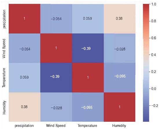 To gain insights into the trends and seasonal characteristics of each meteorological variable time series, this study employed the Pearson correlation coefficient to investigate the interrelationships among different meteorological variables, as depicted in Figure 5. The analysis of the Pearson correlation coefficient revealed a generally weak linear correlation among the four meteorological parameters. This finding indicates that in the present study, adopting nonlinear machine learning models may be more appropriate for predicting forest fire danger levels. Nonlinear models can more effectively capture the complex interactions and nonlinear relationships between variables, potentially enhancing the accuracy and reliability of forest fire prediction. By utilizing these models, we can gain a deeper understanding of the intricate connections between meteorological conditions and forest fire risk, thereby providing more precise predictive tools for the prevention and management of forest fires.