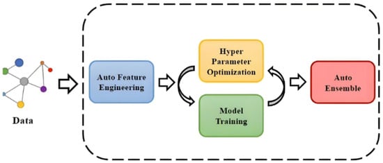 AutoML is a methodology that integrates machine learning with automation techniques, aiming to streamline the various stages of the machine learning process. Its primary objective is to enhance the speed and efficiency of developing machine learning models by automating data preprocessing, feature engineering, model selection, and hyperparameter tuning. AutoML technology enables non-expert data scientists and machine learning practitioners to quickly leverage these techniques to solve real-world problems without delving into underlying algorithms’ complexities and technical details. Furthermore, AutoML can comprehensively explore the model and parameter space to discover more optimized model configurations and parameter combinations, thereby improving the overall performance of machine learning models. Figure 6 depicts the standard workflow of an AutoML tool.