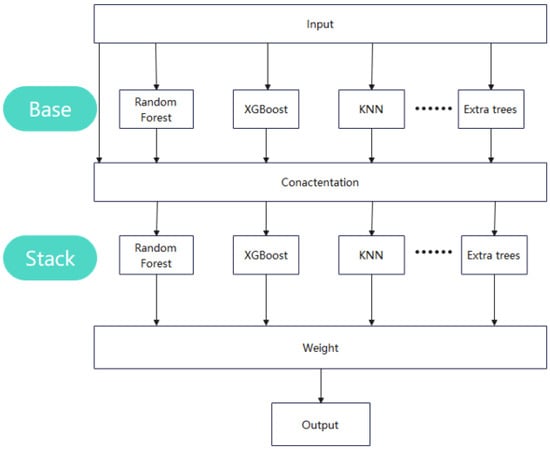 In a multi-layer stacking (Stacking) structure, the base machine learning models are positioned in the lower layers, and their outputs are combined with the original features to form the input features for the upper-layer models. Moreover, a repeated K-fold bagging method is utilized to enhance stacking performance and mitigate the risk of overfitting. The K-fold bagging approach involves randomly splitting the dataset into K different subsets and training K copies of the model using K-1. Each model iteration generates out-of-fold (OOF) predictions on the held-out validation subset during this process. Subsequently, higher-level models are trained exclusively on the OOF predictions of the lower-level models. This methodology aids in improving the model’s predictive accuracy and addresses overfitting concerns by preventing the leakage of training data information during the validation phase.