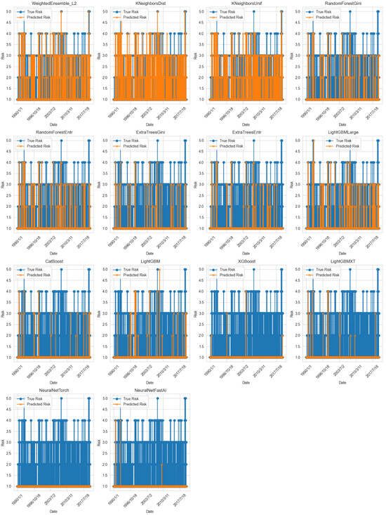 A relationship between the predicted and actual forest fire danger levels was established to visually demonstrate the prediction accuracy, as shown in Figure 8. This figure compares actual risk with predicted risk for different models in forecasting forest fire risk. Each subplot represents a specific model, with the horizontal axis indicating the period (from 1 January 1994, to 31 December 2023) and the vertical axis representing the range of risk values (1 to 5), which correspond to low, moderate, high, very high, and extremely high forest fire levels, respectively.