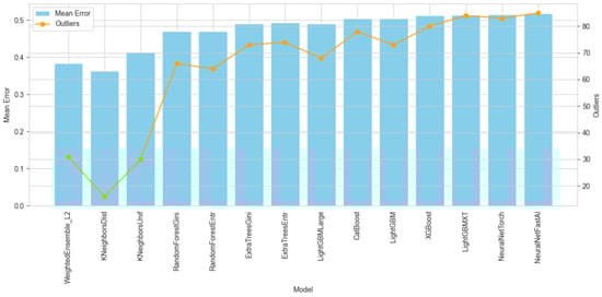 Notably, the deep learning models NeuralNetTorch and NeuralNetFastAI have the most significant mean errors and the highest number of outliers, which could be due to their susceptibility to the influence of noisy data and outliers during the training process.