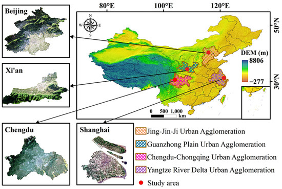 As illustrated in Table 1 and Figure 1, the study focuses on the four megacities in China: Beijing, Shanghai, Chengdu, and Xi’an. Covering a total area of 471,900 square kilometers, the permanent population reached 80.86 million by the end of 2022, with a gross domestic product (GDP) of CNY 11.86 trillion, accounting for 9.78% of the national GDP. Beijing has a temperate continental climate, with an average annual temperature of 12.2 °C and average annual precipitation of 571.8 mm. Shanghai has a subtropical humid monsoon climate, with an average annual temperature of 18.5 °C and average annual precipitation of 1016.1 mm. Xi’an experiences a temperate continental climate, with an average annual temperature of 16.6 °C and average annual precipitation of 553.3 mm. Chengdu has a subtropical monsoon climate, with an average annual temperature of 18.2 °C and average annual precipitation of 866.2 mm.