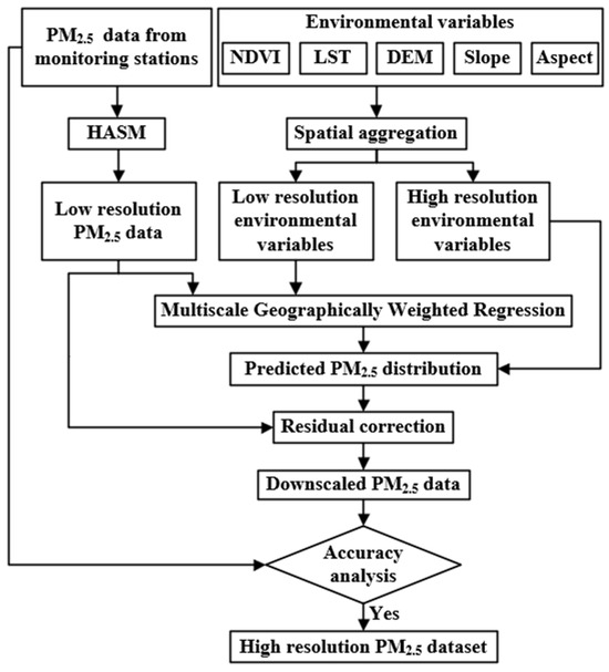 - Based on the HASM model, interpolation was performed on PM2.5 monitoring station data to generate PM2.5 data with a spatial resolution of 1000 m. High-resolution data for LST, NDVI, DEM, slope, and aspect were extracted from environmental variables. These datasets were then resampled and spatially aggregated to 250 m and 1000 m resolutions, respectively.