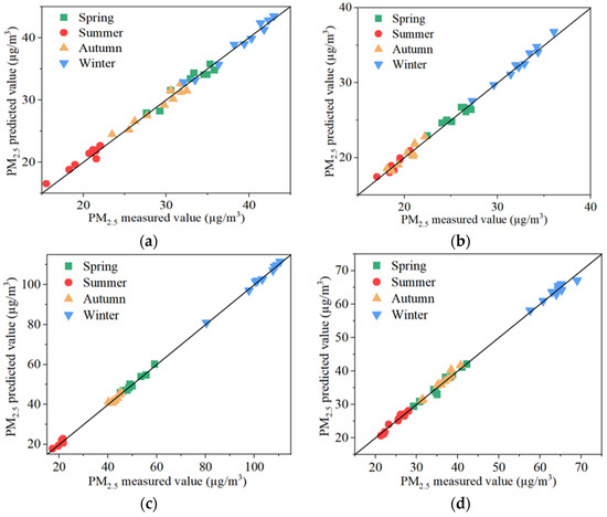 To assess the efficacy of the proposed method, PM2.5 concentration data from 200 sites across four major cities were divided into an interpolation dataset and a validation dataset. A total of 80% of the data were used for interpolation, and the remaining 20% were reserved for validation. The method’s performance was evaluated using two statistical metrics: R2 and RMSE. As illustrated in Figure 3, the majority of scatter points in each season are clustered near the line y = x, signifying that the predictions generated by the proposed method align closely with the observed values. This indicates the model’s strong predictive accuracy across all seasons.