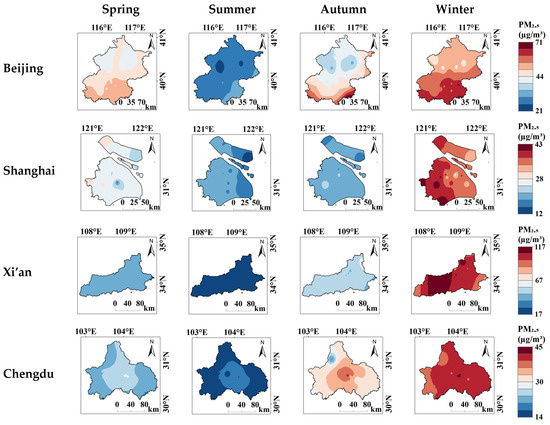Seasonal PM2.5 concentration surfaces for the four megacities predicted by the proposed method.