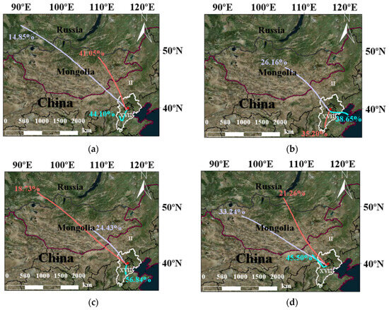 Seasonal cluster–mean backward trajectories arriving in Beijing during 2022, showing the main transport pathways of air masses (II: Inner Mongolia Autonomous Region, XVIII: Hebei Province). (a) Spring. (b) Summer. (c) Autumn. (d) Winter.