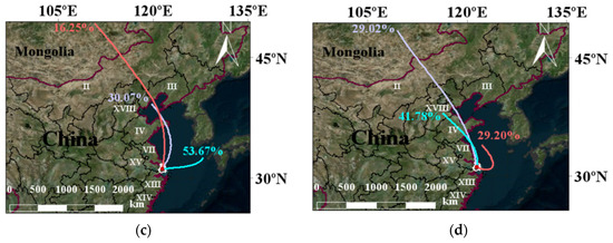 Seasonal cluster–mean backward trajectories arriving in Shanghai in 2022, showing the main transport pathways of air masses (II: Inner Mongolia Autonomous Region, III: Liaoning Province, IV: Shandong Province, VII: Jiangsu Province, XIII: Zhejiang Province, XIV: Fujian Province, XV: Anhui Province, XVIII: Hebei Province). (a) Spring. (b) Summer. (c) Autumn. (d) Winter.