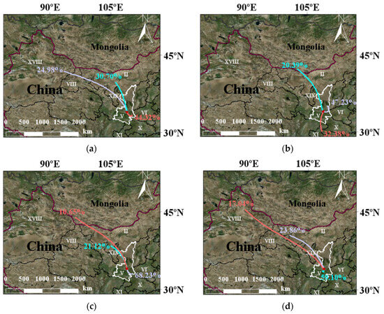 Seasonal cluster–mean backward trajectories arriving in Xi’an in 2022, showing the main transport pathways of air masses (II: Inner Mongolia Autonomous Region, V: Shaanxi Province, VI: Henan Province, VIII: Gansu Province, X: Hubei Province, XI: Chongqing City, XVIII: Xinjiang Uygur Autonomous Region). (a) Spring. (b) Summer. (c) Autumn. (d) Winter.