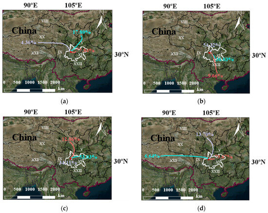 Seasonal cluster–mean backward trajectories arriving in Chengdu in 2022, showing the main transport pathways of air masses (V: Shaanxi Province, VIII: Gansu Province, IX: Sichuan Province, XI: Chongqing City, XXI: Tibet Autonomous Region, XXII: Guizhou Province). (a) Spring. (b) Summer. (c) Autumn. (d) Winter.
