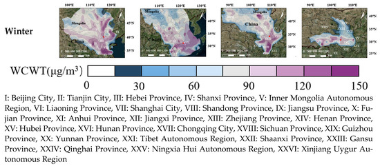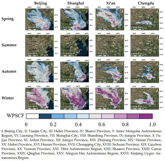To further investigate the seasonal PM2.5 transport in the four cities and determine the potential source regions and their contributions for each city in different seasons, this study employed the PSCF and CWT models to analyze the potential source regions of PM2.5. The results of the PSCF analysis are presented in Figure 9, and the CWT analysis results are shown in Figure 10. In this study, regions with WPSCF values exceeding 0.8 are considered primary potential source regions of PM2.5. Based on WCWT values, high contribution source regions (120–150 μg/m3), medium–high contribution source regions (90–120 μg/m3), medium contribution source regions (60–90 μg/m3), and low contribution source regions (<60 μg/m3) are classified.