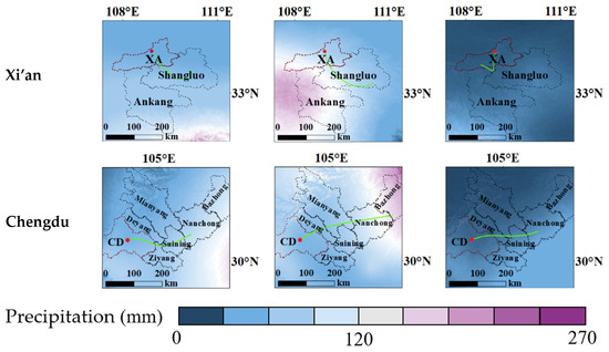Numerous studies investigating the relationship between PM2.5 concentrations and rainfall have demonstrated that precipitation facilitates the removal of PM2.5 from the atmosphere through a process known as wet deposition [68,69]. As raindrops traverse the atmosphere, they absorb and transport PM2.5 particles to the surface, thereby directly reducing PM2.5 concentrations in the air. Some studies have shown that the vertical movement of cold sinking air and warm rising air during precipitation enhances atmospheric convection, which promotes air mixing and, consequently, dilutes PM2.5 concentrations [70,71]. As shown in Figure 12, during winter, the primary pollution pathways leading to Beijing, Xi’an, and Chengdu experience precipitation levels ranging from 30 to 60 mm, while Shanghai’s primary pollution pathway receives precipitation between 30 and 90 mm. These are the lowest precipitation levels observed throughout the year for these regions. Numerous studies have found that the limited precipitation in winter reduces the effectiveness of wet deposition in removing PM2.5 from the atmosphere [72]. Combined with weak atmospheric convection, this results in diminished natural cleaning of PM2.5. This may explain why winter tends to have the highest PM2.5 concentrations along primary pollution pathways. In spring, the effectiveness of wet deposition in removing PM2.5 begins to improve, accompanied by slight enhancements in atmospheric convection; however, the removal efficiency remains limited [73]. Precipitation along the primary pollution pathways to each city shows a modest increase in spring. In Beijing, precipitation ranges from 60 to 90 mm, while Shanghai experiences an increase to 120–150 mm. Xi’an and Chengdu both report precipitation levels between 90 and 120 mm along their primary pollution pathways. As a result, while PM2.5 pollution remains significant along the primary pathways in spring, some alleviation is observed compared to winter levels. In autumn, precipitation along the primary pollution pathways increases further. Average precipitation reaches approximately 105 mm in Beijing, 150 to 180 mm in Shanghai, around 140 mm in Xi’an, and between 120 and 180 mm in Chengdu. This increase in precipitation contributes to relatively lower PM2.5 concentrations compared to winter and spring, leading to improved air quality along these routes. These findings are consistent with previous research on the effects of precipitation on PM2.5 transport and dispersion during the autumn months [74].