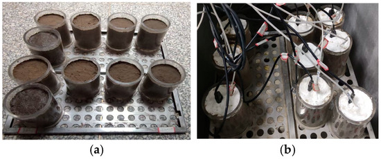 The soil, configured in advance, was loaded into an acrylic cylinder with an inner diameter of 70 mm and a height of 100 mm. This cylinder was then compacted twice, with each layer compacted to a height of 40 mm. Compaction was employed to control the experiment soil sample compression density, set at 90%. During the compaction process, a temperature sensor was placed into the cylinder. Once this process was complete, the mouth of the cylinder was sealed with thermal insulation cotton. This ensured that the containers were sealed and that the temperature measurement probe’s temperature remained constant. The contaminated soil to be measured was put into the freezing refrigerator for freezing. Before freezing, the soil was maintained at room temperature for some time to stabilize the temperature. After that, it was transferred to a device capable of modulating the environmental temperature to ensure consistency. The temperature sensor was connected to the data collector, which collected data every 30 s and transmitted the data to the computer for storage. The freezing time of the test soil was greater than 12 h. The soil samples are melted with the power off and at room temperature for 12 h. Figure 2 is a physical picture of soil sample compaction and freezing.