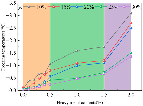 - With the increase in heavy metal content, the freezing temperature of soil with 0–0.5% heavy metal content decreased rapidly, the freezing temperature of soil with 0.5–1.5% heavy metal content decreased slowly, and the freezing temperature of soil with 1.5–2% heavy metal content decreased rapidly. Soil freezing and thawing have a small effect on freezing temperatures.