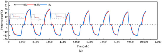 Figure 4 shows the temperature change curve of the soil with 15% initial water content under the action of seven freeze–thaw cycles. It can be seen from Figure 4 that the repeated freeze–thaw action of soil does not affect the freezing temperature of the soil. For example, in the results of the previous three soil freeze–thawing experiments, the freezing temperature of the soil was always M = 0% < M = 0.5% < M = 1%.