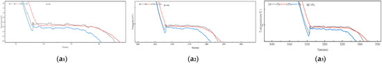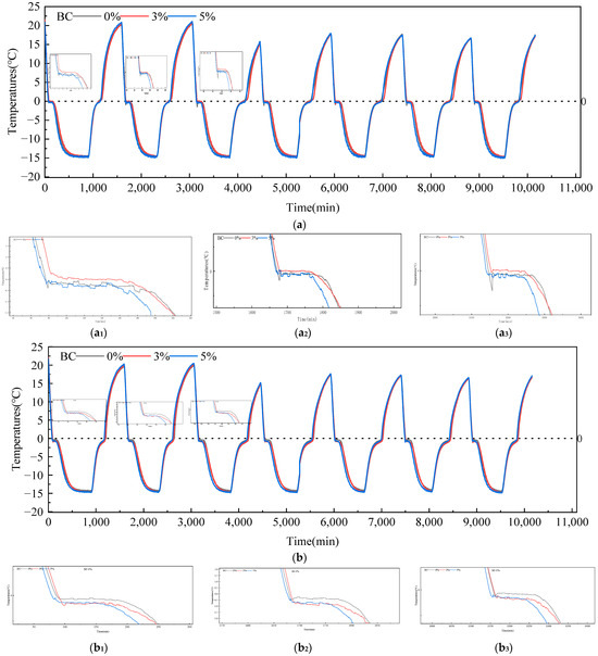 Effect of biochar content on freezing temperature of different lead-contaminated soils under freeze–thaw cycle. (a) M = 0%, W = 15%, (a1) first freeze, (a2) second freeze, (a3) third freeze, (b) M = 0.5%, W = 15%, (b1) first freeze, (b2) second freeze, (b3) third freeze, (c) M = 1%, W = 15%, (c1) first freeze, (c2) second freeze, (c3) third freeze.