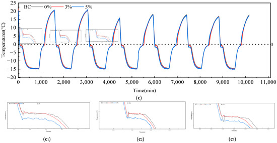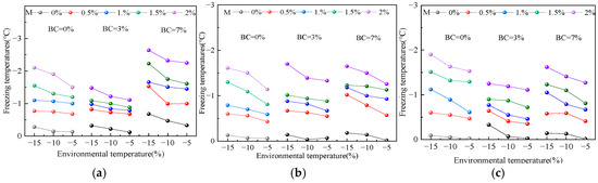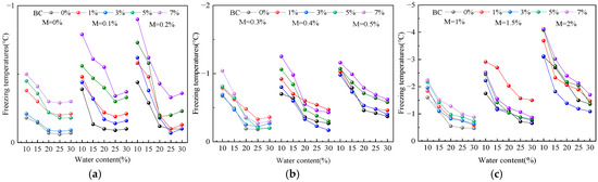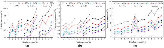 Effects of different biochar content on soil freezing temperature. (a) M = 0.1–0.2%, (b) M = 0.3–0.5%, (c) M = 1–2%.