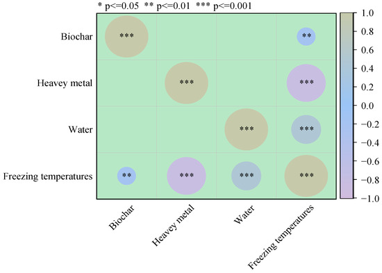 Figure 7 shows a heat map of the correlation analysis based on the experimental data, with the circles’ size representing the correlation’s strength and the different colors representing the different types of correlation. Figure 7 shows that among the three factors, namely biochar, heavy metals, and water content, heavy metals had the most significant effect on freezing temperature, followed by water content and biochar. The effects of heavy metals and biochar on freezing temperature were negatively correlated, whereas the effect of moisture content on freezing temperature was positively correlated. In previous studies, Bing et al. [2] and Cao et al. [6] proved that the effect of solute on freezing temperature is greater than that of water on freezing temperature, which is the same as the results obtained in this experiment, and it was also found that among the above three factors, biochar has the least effect on soil freezing temperature.